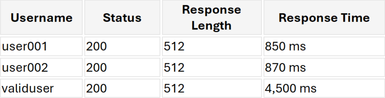 - Shorter response time (e.g. <1 second) → Username does not exist.